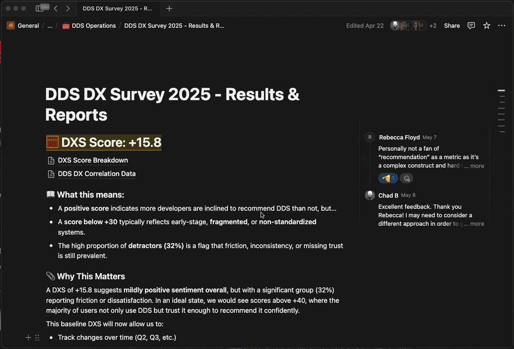 The DX Score gave the org a northstar metric—a quantitative way to track Design System health over time. Without baseline measurement, you can't prove progress or prioritize improvements systematically. Creating the metric was as important as the initial research itself.